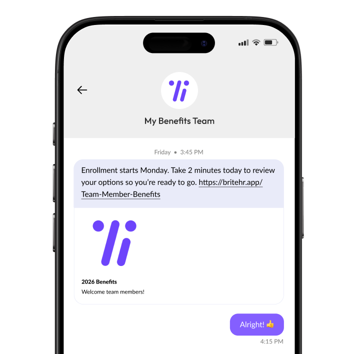 Text employees key info before, during, or after enrollment. Fast, timely, and hard to miss.